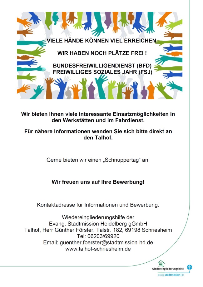 Das Wichernheim in Heidelberg und der Talhof in Schriesheim bieten Plätze für den Bundesfreiwilligendienst (BFD, Bufdi) und das Freiwillige Soziale Jahr (FSJ) an. Haben Sie Interesse an Begegnungen mit unterschiedlichen Menschen, an spannenden Aufgaben und vielfältigen Tätigkeiten? Dann sind Sie bei uns richtig! Sie können gerne einen Termin mit uns vereinbaren, um unsere Einrichtung und unsere Arbeit kennen zu lernen.