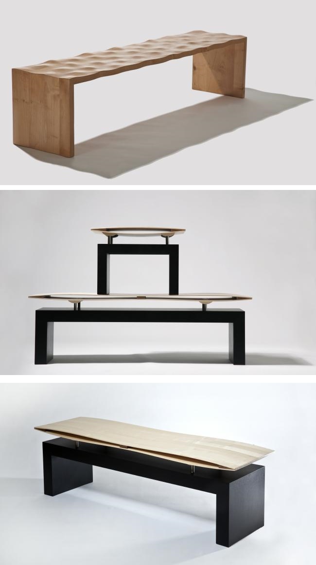 Hand-Werk: Bei der Bearbeitung des inhomogenen Materials Holz entstehen durch erlernte und bewährte Techniken sowie durch sehr experimentelles Versuchen immer wieder neue Entwürfe. Da werden Grenzen der Tragfähigkeit in der Reduktion von Materialdicken ertastet, die Zufälligkeit von gespaltenen Holzstrukturen zu einem habtischem Erleben oder Holz zu einer leicht schwingenden Wasseroberfläche geformt.