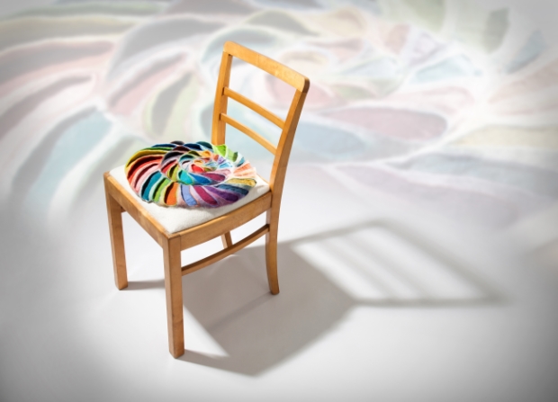 Bis zum 26.3.2014 können Gebote im Stuhlmuseum abgegeben werden (Vordrucke für Kontaktdaten und Gebote liegen dort aus). Nach Ende der Ausstellung wird der Stuhl an den Höchstbietenden und neuen "Stuhl-Be-Sitzer" überreicht.Info zum Stuhl: Bei dem Exponat handelt es sich um einen Holzstuhl, dessen Sitzpolster / Bezug aus reiner Merinowolle besteht und nach alter Tradition des Filzens in aufwendiger Handarbeit hergestellt wurde. Beiden Künstlern ist in ihrer Arbeit wichtig, Kunst und Nutzen zu verbinden. Für das Motiv inspirierte die Form von Ammoniten, im Zusammenspiel mit fröhlichen Farben entstand so ein Stuhl, der das Leben bunt macht.