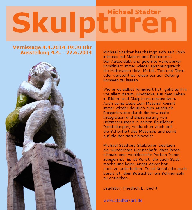 Michael Stadter beschäftigt sich seit 1996 intensiv mit Malerei und Bildhauerei. Der Autodidakt und gelernte Handwerker kombiniert immer wieder spannungsreich die Materialien Holz, Metall, Ton und Stein oder versteht es, diese pur zur Geltung kommen zu lassen.