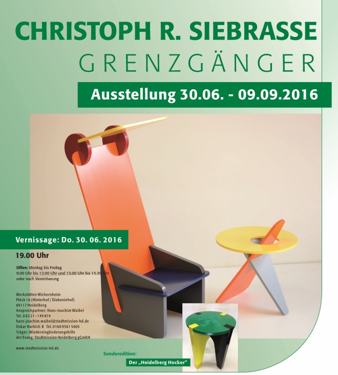 Bei der Planung für die Ausstellung „Grenzgänger“ im Heidelberger Stuhlmuseum war der Künstler und Gestalter Christoph R. Siebrasse von dem sozialen Engagement der Wiedereingliederungshilfe der Evang. Stadtmission HD beeindruckt. Um die Arbeit mit wohnungslosen Frauen und Männern zu unterstützen, hat Herr Siebrasse dankenswerter Weise dem Wichernheim kostenlos eine Lizenz zur Fertigung eines Stuhles zur Verfügung gestellt. Dieser „Heidelberg Hocker“ wird in der Werkstatt des Wichernheimes gefertigt. Der Erlös kommt zu 100 % der Unterstützung unserer Arbeit zugute. Künstlerische Aspekte und handwerkliches Können verbinden sich zu einer sinnerfüllten Beschäftigungsmöglichkeit für wohnungslose Menschen und tragen somit zu einer Wiedereingliederung in die Gesellschaft bei.