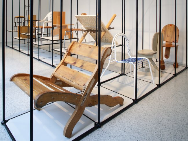 Die Sitzmöbel sind vom Künstler modifizierte Fundstücke, Stühle und Hocker von Sperrmüll und Dachboden. Die Möbel sind häufig Komposite, wie z.B. der „Monostuhl“ – ein brauner Hocker aus der sozialistischen Zeit, über den ein Gartenstuhl aus weißem Kunststoff gestülpt ist. Gemeinsam bilden sie ein Ganzes, das nicht recht zusammenpassen will.