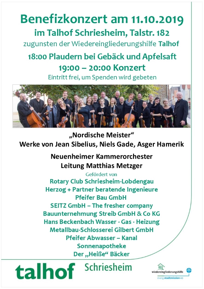 Am Freitag, den 11.10.19 um 18:00 Uhr findet im Talhof Schriesheim ein Benefizkonzert des Neuenheimer Kammerorchester mit Werken der Nordischen Meister Jean Sibelius, Niels Gade und Asger Hamerik unter der Leitung von Matthias Metzger statt. Der Reinerlös dieses Konzerts ist für die Arbeit der Wiedereingliederungshilfe für Wohnungslose im Talhof bestimmt. Der Eintritt ist frei. Um Spenden wird gebeten.